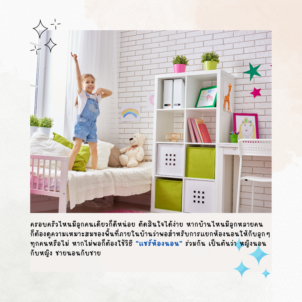 ครอบครัวไหนมีลูกคนเดียวก็ดีหน่อย ตัดสินใจได้ง่าย หากบ้านไหนมีลูกหลายคนก็ต้องดูความเหมาะสมของพื้นที่ภายในบ้านว่าพอสำหรับการแยกห้องนอนให้กับลูกๆ ทุกคนหรือไม่ หากไม่พอก็ต้องใช้วิธี “แชร์ห้องนอน” ร่วมกัน เป็นต้นว่า หญิงนอนกับหญิง ชายนอนกับชายพื้นที่ใช้สอยที่เหมาะสม