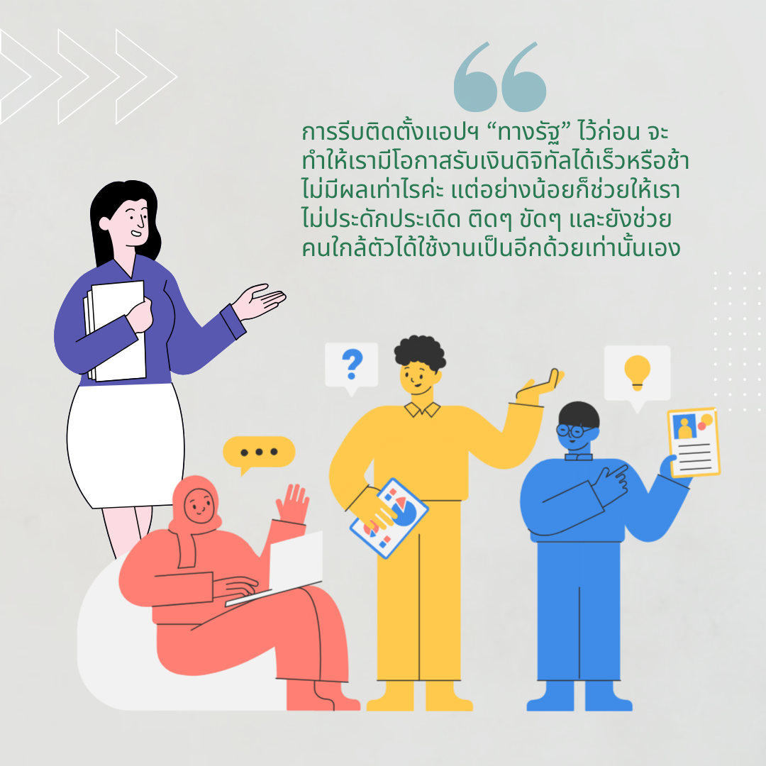 การรีบติดตั้งแอปฯ “ทางรัฐ” ไว้ก่อน จะทำให้เรามีโอกาสรับเงินดิจิทัลได้เร็วหรือช้าไม่มีผลเท่าไรค่ะ แต่อย่างน้อยก็ช่วยให้เราไม่ประดักประเดิด ติดๆ ขัดๆ และยังช่วยคนใกล้ตัวได้ใช้งานเป็นอีกด้วยเท่านั้นเอง